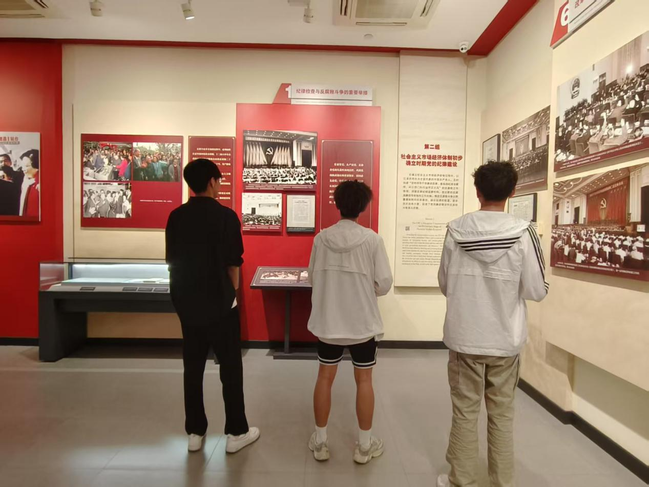 在中国共产党纪律建设历史陈列展,一张张珍贵的历史照片与仿真场面生动再现了党在不同历史时期纪律建设的探索历程。学员们沿着“创立与探索”“推进与曲折”“恢复与发展”“新时代新征程”的时间脉络,系统回顾了“三大纪律八项注意”到“八项规定”的纪律建设发展史。2023级发展对象周游在参观后表示,“作为新时代青年学生,我将时刻以党纪为尺,努力扣好人生‘第一粒扣子’。