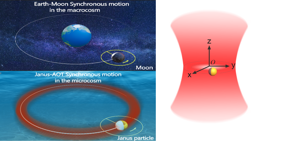 月球-地球同步转动备受关注,被普遍认为是潮汐锁定效应的结果。然而,在微观世界中,如此独特的地月同步转动极为罕见且难以观测。beat365官网beat365英国正版唯一网址刘静老师与华南理工大学李志远教授、中央民族大学郭红莲教授和华南理工大学龙利博士合作,研究利用红外激光束和锥透镜构成环形光阱,制备具有不对称结构的Janus粒子,成功捕获并观察到Janus粒子在环形光阱(Annular Optical Trap,AOT)中同步转动。Janus粒子所受力和力矩与其位置和取向高度耦合,自驱动地进行平动和转动,揭示了微观世界中“月球效应”。