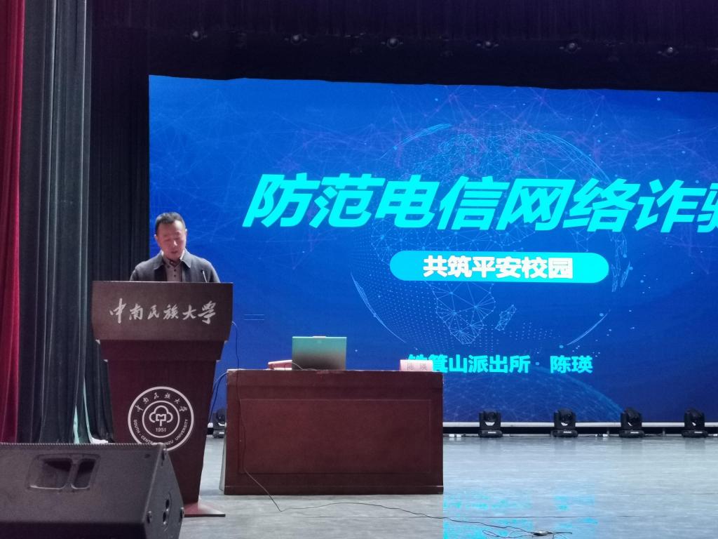 讲座中,陈警官从什么是网络诈骗、学校诈骗常见的形式有哪些、如何预防被骗三个方面为在场师生详细讲解了如何甄别、远离诈骗陷阱。陈警官针对当前大学生在群体面对各类诈骗案件时普遍存在的防范意识差、辨别能力弱等现象,生动鲜活地向同学们展示了近期高校发生的真实案例,重点讲解了“裸聊裸贷”、兼职刷单、快递客服赔款、冒充熟人诈骗、冒充公检法要求转账汇款等迷惑性较强的网络诈骗,细致分析了作案手段和案件特点。