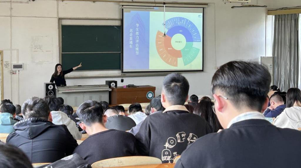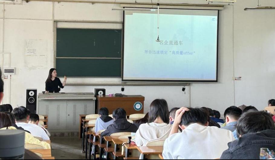 就业指导讲座上,老师通过PPT展示,围绕春招大致情况、各大企业招聘岗位及未来晋升空间、福利待遇和招聘流程等方面做了详细介绍,帮助同学们了解春招企业招聘详情及岗位需求,并介绍名企直通车项目,帮助同学们在未来求职中有目标,有方法。