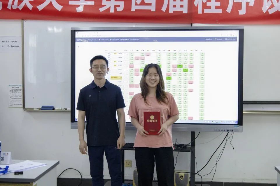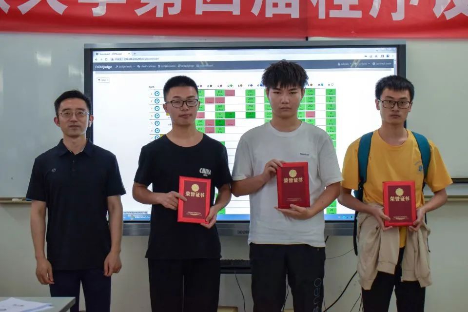 通过前期宣传活动,两百余名报名者通过赛前简单培训并参加线上初赛。经过组委会查重、评分、排名后,共计120名参赛者进入线下决赛。比赛当天,线上线下共计400余人成功参赛,比赛结束后,全体参赛人员齐聚教室,icpc实验室成员对本次竞赛最后一小时答题情况进行滚榜展示并对题目进行讲解。最终,通过系统评分汇总,评选产生并公布了一等奖3名、二等奖9名、三等奖15名以及最佳女生奖1名。由负责老师为获奖同学颁发荣誉证书并表示祝贺。
