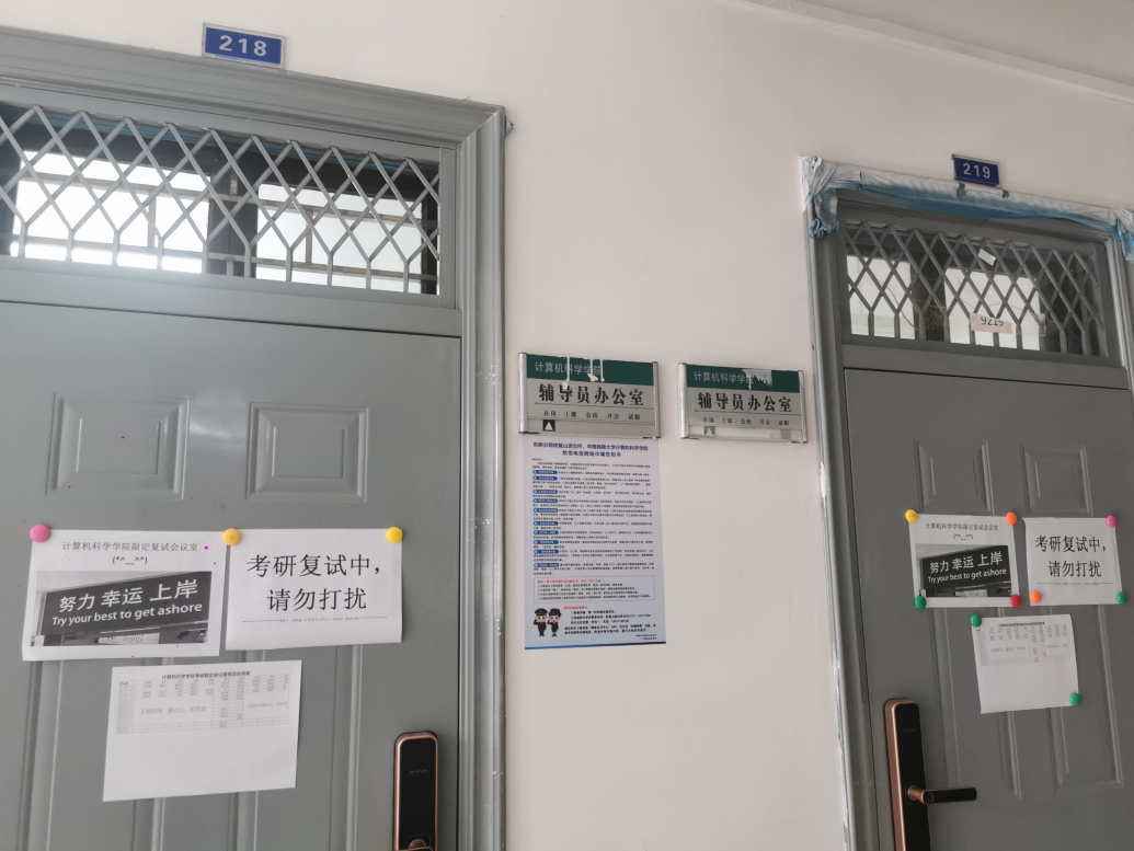 “没有安静的环境”、“不方便进行摄像头设置”、“要双机位拍摄”、“宿舍网速慢”、“外面酒店太贵了”……受疫情影响,大部分考研过线学生缺乏合适的研究生复试场所,在收到大家的反馈后,计科院迅速研究部署。在学院领导的大力支持下,在各年级辅导员、实验员和教秘老师的鼎力支持下,积极协调学院会议室、党员活动室、教师办公室等,布置成为复试考场,为考研学子提供安静舒适、温馨明快的“云复试”空间。