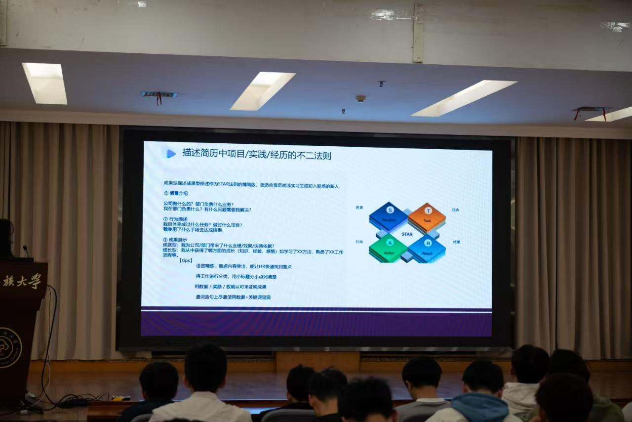 谈及简历撰写,杨晓涵女士更是倾囊相授。她详细介绍了企业筛选简历的流程,强调了关键词在简历中的重要性,并建议同学们以企业需求为导向,精准匹配个人经历与岗位要求。她推荐采用“STAR法则”构建简历,通过清晰的结构、量化的成果和具体的行动来展示个人优势,使简历更具竞争力。在面试技巧方面,杨晓涵女士从面试官的角度出发,详细阐述了面试前的准备工作,包括着装、举止等细节。她指出,面试不仅是对专业知识的考察,更是对综合素质的检验。她介绍了“STAR”结构在面试中的应用,强调真实性、完整性和具体性,帮助同学们更好地展现个人魅力。此外,她还分享了群体面试的技巧及面试官关注的重点,为同学们提供了宝贵的面试实战指南。