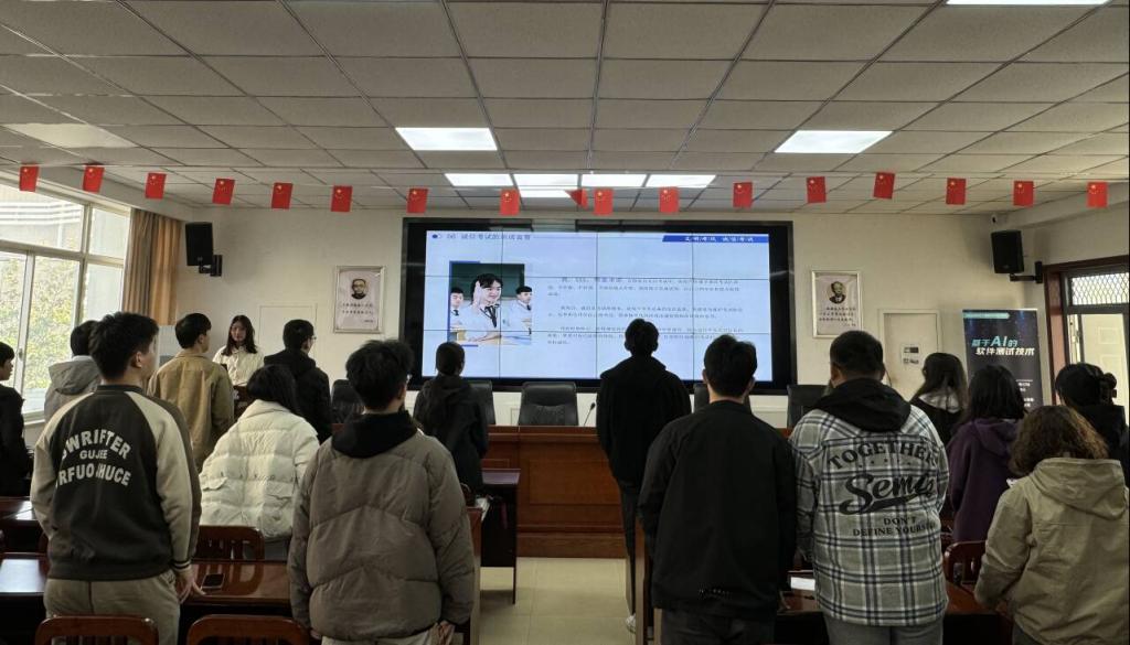在每一场班会中,班导师们都给予了极高的重视并积极参与,班委们也发挥了重要作用。班导师们首先强调了诚信对于个人成长、学术研究乃至社会发展的重要性,明确指出诚信考试不仅是对知识的尊重,更是对自己和他人责任的体现。部分班级通过多媒体展示,回顾了学院在诚信教育方面的成就,同时带领同学们集体学习了学校关于考试违纪和作弊行为处理办法的相关文件,提醒同学们遵守考试纪律,牢记诚信应考的要求。