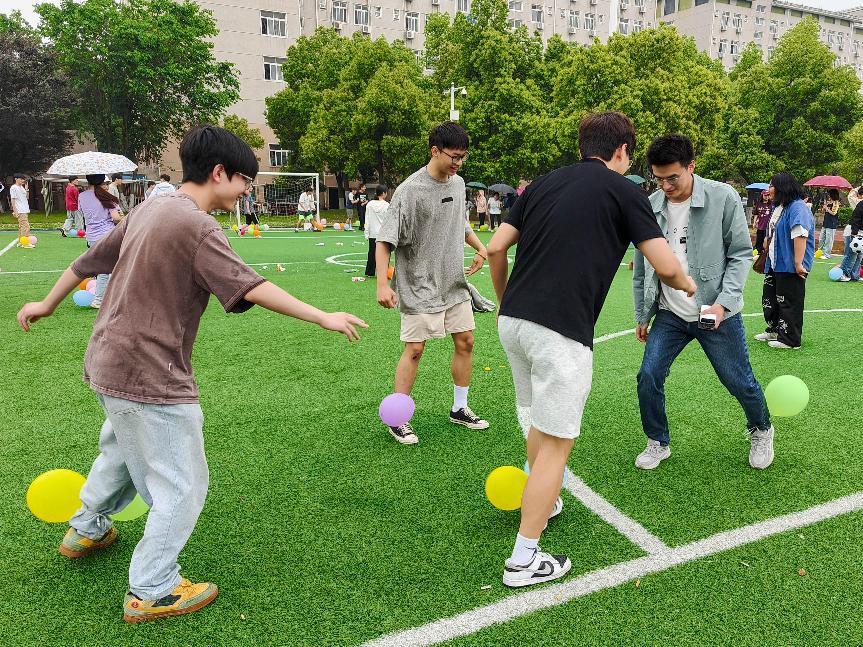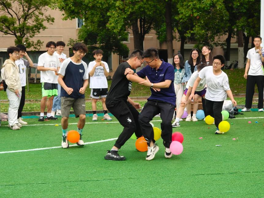 压轴登场的“踩气球”游戏,将全场气氛推向最高潮。绑在参与者脚踝上的气球,宛如等待绽放的“青春花火”。随着一声令下,大家如离弦之箭般冲入“战场”,眼神中满是斗志与自信。气球的爆裂声“砰砰”作响,与此起彼伏的加油助威声交织在一起,谱写出激昂的青春乐章。2023级两位辅导员老师也投入其中,现场气氛十分热烈。