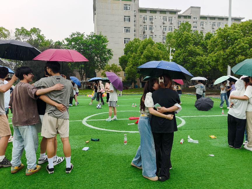 趣味运动会开场时,天空突然下起朦胧细雨,但雨水并没有浇灭同学们参与本次活动的澎湃热情。在进行“时间炸弹”游戏的现场,随着节目主持人手中的闹钟开始计时,空气里瞬间弥漫起紧张又兴奋的气息,倒计时声如同擂响的战鼓,敲击着每个人的心弦。