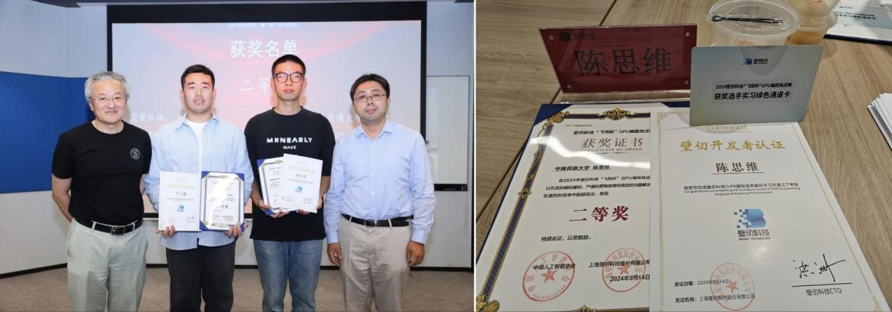 近日,备受瞩目的2024壁仞科技“飞翔杯”GPU编程挑战赛圆满落幕,来自全国多所知名高校的顶尖学子汇聚一堂,展开了一场激烈的技术较量。经过激烈角逐,我院硕士研究生陈思维同学,在导师康怡琳老师的悉心指导下,在众多参赛者中脱颖而出,荣获本次大赛的二等奖,并于9月14日受邀参加壁仞科技线下颁奖典礼。