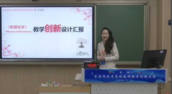 比赛中,韩晓乐老师汇报的课程是《物理化学》,她从课程的基本情况、痛难点分析入手,进一步阐释教学创新理念和教学设计,结合教学活动的开展,对教学成效进行了全面、客观的分析。
