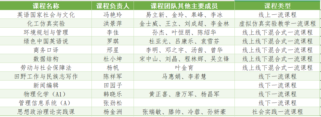 入选课程覆盖五大类课程类型,其中线上线下混合式一流课程5门、线下一流课程4门、线上一流课程1门、虚拟仿真实验教学一流课程1门、社会实践一流课程1门。