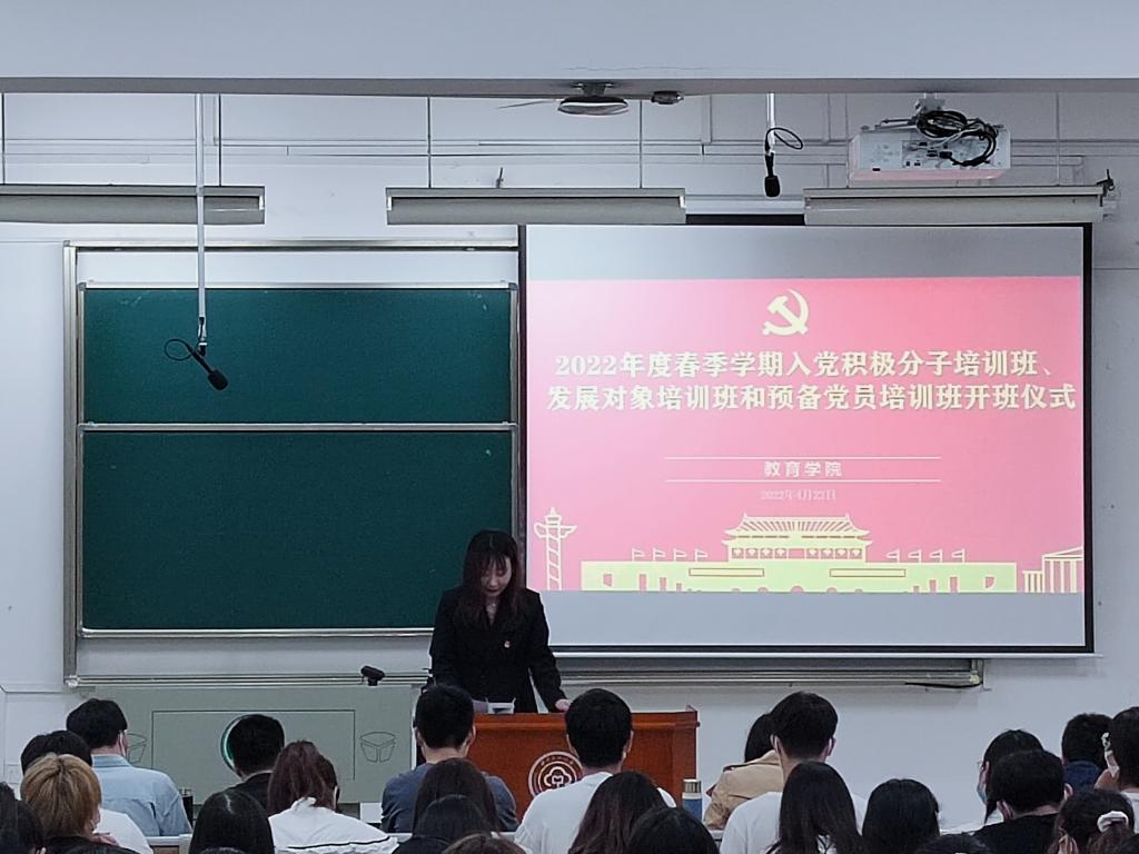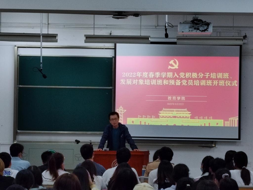 为加强学生党员思想政治教育,增强理论素养,提高政治觉悟。4月22日晚,教育学院于15栋221举办了春季学期党课培训班开班仪式。院党委书记周刚、党委副书记孙冰出席了本次大会。