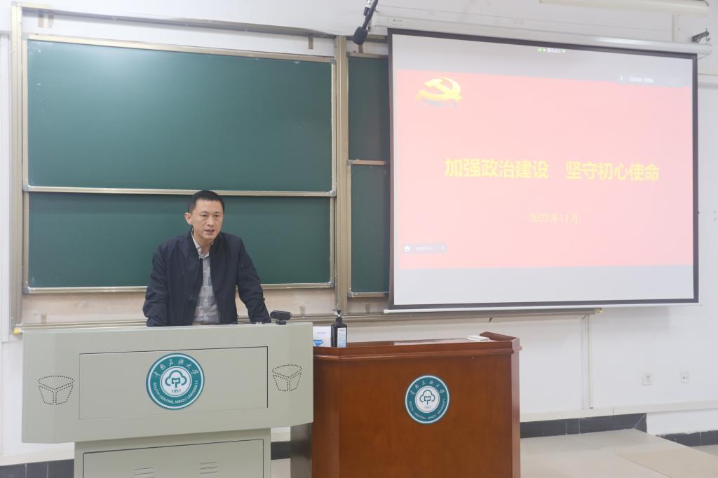 周刚带领大家学习党课第一讲——《加强政治建设,坚守初心使命》。他从学习贯彻党的二十大精神、深刻理解党的政治建设的重要意义、牢牢把握党的初心和使命的科学内涵、新时代如何加强政治建设践行初心使命四个方面为大家带来了一堂内容丰富的党课。课堂上,他与大家一起回溯过往,共同回看社会主义发展历程,回顾十八大以来我们取得的辉煌成就。他还引导大家看今朝、展未来,指出在世界百年未有之大变局的时代背景之下,共产党员要深刻理解党的政治建设的重要意义,把青年工作作为战略性工作来抓,用党的科学理论武装青年,用党的初心使命感召青年,做青年朋友的知心人、青年工作的热心人、青年群众的引路人;广大青年更要承继光荣传统、赓续红色血脉,把个人理想自觉地融入中国特色社会共同理想之中,把个人奋斗融入实现社会现代化共同奋斗之中,让青春在全面建设社会主义现代化国家的火热实践中绽放绚丽之花。