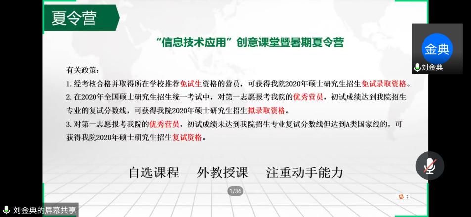 然后,刘金典同学向大家分享了考研经验。刘金典同学首先介绍了华中师范大学教育信息技术学院的基本情况,然后就思想政治理论、英语、教育综合、C语音程序设计四个考试科目分享了自己的复习方法和时间安排,最后介绍了有关复试和夏令营的具体情况。