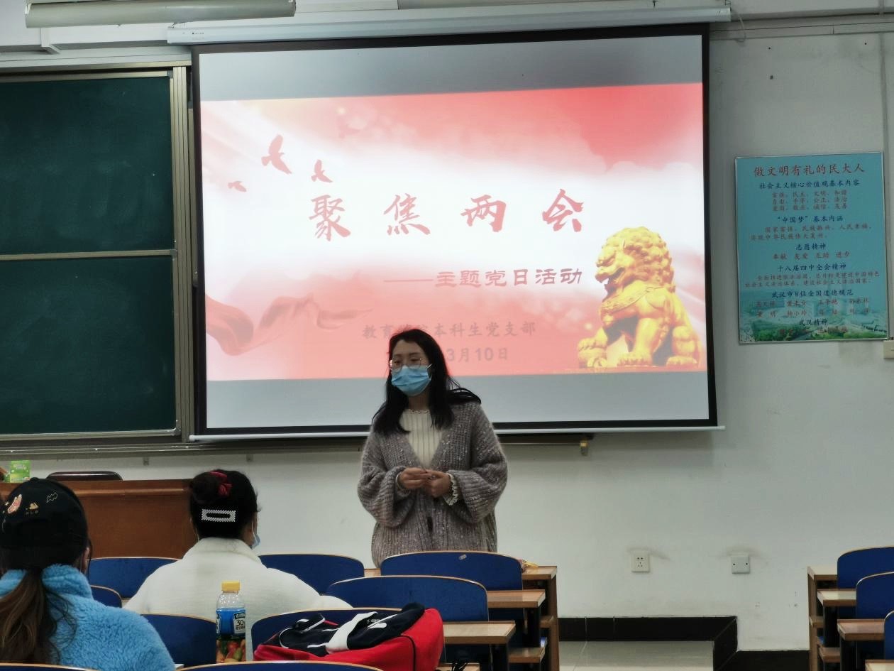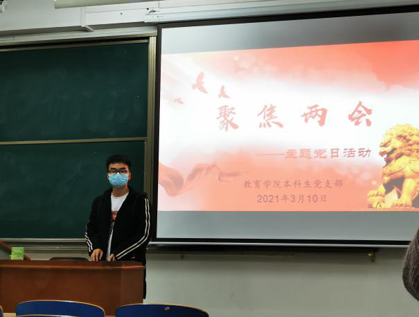 一年一度的全国两会再次到来,为了认真贯彻“两会”精神,提高全体党员的政治素养,从而更好地发挥党员的模范带头作用,3月10日晚,教育学院本科生党支部在15栋410教室开展了聚焦“两会”主题党日活动,宣传本次“两会”的重要精神。辅导员谭闺臣老师、教育学院本科党支部全体成员参加了本次活动。