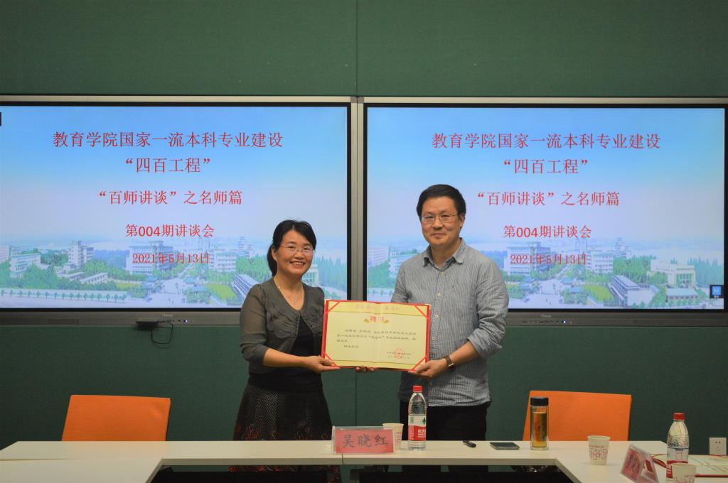 5月13日,beat365英国正版唯一网址教育学院“四百工程”——“百师讲谈”之名师篇第004期讲谈会在15栋733教室顺利举行。本次讲谈会的主讲人为武汉第三寄宿中学、武汉第三初级中学吴晓红校长。教育学院罗建河副院长与汪丞教授、本科学生参加了本次讲谈会,罗建河副院长代表学院向吴校长颁发了“国家级一流本科‘教育学’专业实践导师”与“教育硕士专业实践导师”聘书。