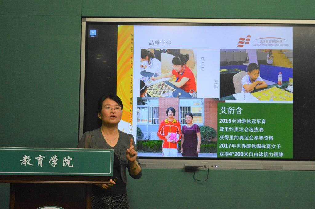 吴晓红校长本次演讲的主题是“新时代呼唤‘四有教师’”。吴校长首先阐述了“四有教师”的内涵,“四有”好教师须有理想信念,有道德情操,有扎实知识,有仁爱之心。吴校长列举了武汉第三寄宿中学具体的教学实践活动与生动的学生培养实例,向同学们介绍了真实的学校教育,教师所面对的是学生的特殊性和多变性,在复杂多变的教育教学实践中,教师需具备超前的意识与创造性,引导学生成长。随后,吴校长阐述了新时代教育发展背景下,教师需具备“以天下为己任”的崇高职业意识与时代担当,成为新时代的“四有教师”,这在学生成长中起到不可替代的作用。