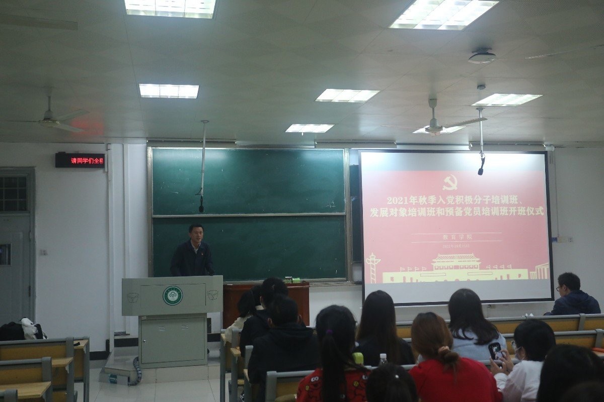 为做好新形势下的学生党员发展和教育管理服务工作,提高我院预备党员、发展对象、入党积极分子的党性修养和学生党员队伍整体素质,教育学院于2021年10月15日举行了2021年秋季学期党课培训班开班仪式。院党委书记周刚同志、党委副书记孙冰同志出席了本次会议。