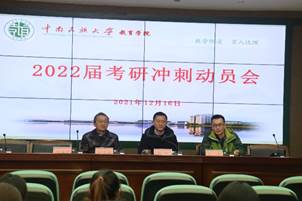 为鼓励教院学子考研冲刺,缓解考研紧张情绪,提供考研经验,增强考研信心,提升考研竞争力,12月16日下午,教育学院于15-741多功能厅举办了2022届考研冲刺动员大会。教育学院党委书记周刚、院长田恩舜、党委副书记孙冰、副院长罗建河、教育学党支部书记张征、应用心理学教师鲍旭辉、辅导员谭闺臣和2022届考研学生参加,会议由副书记孙冰主持。