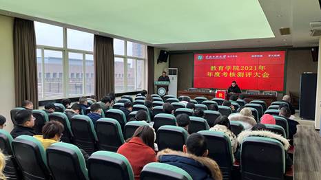 1月7日上午,教育学院在15-741会议室召开2021-2022-1学期第五次全院教职工大会暨年度考核测评大会,会议由学院党委书记周刚主持,学院全体教职工和10位学生代表参会。