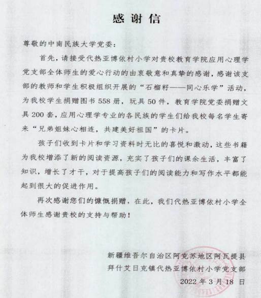 2021年11月,得知新疆维吾尔族自治区阿克苏地区阿瓦提县某乡村学校图书和学习用品紧缺后,支部组织全校开展图书资料捐赠,并开展大学生与小学生结对助学活动,受到了学校学生和家长们的一致好评和感谢,专门向学校党委发来感谢信。2022年3月,接到广西凭祥市民族希望实验学校求助后,支部在学院党委的支持下,将学生实习转为线上帮扶,为疫情中的孩子开展在线教学和辅导。