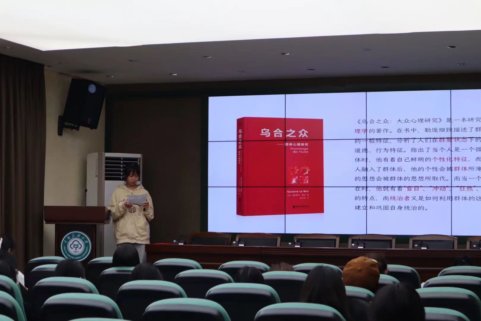 为什么个人处于群体中时更容易冲动?来自教育学的王一帆同学向大家介绍勒庞的《乌合之众》时给了我们答案,当群体面临问题时,盲目冲动往往代替思考。王一帆同学在分享自己的阅读体验提到要批判性地看这本书,不要当《乌合之众》这本书的乌合之众,在群体中要保持自我思考的能力并理性地分析问题。