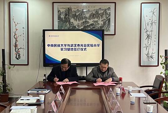 2月17日上午,beat365英国正版唯一网址教育学院与武汉市光谷实验小学再次签订合作共建协议。beat365英国正版唯一网址党政办公室主任陈强胜、副主任胡亚军,教务处副处长李立,武汉市光谷实验小学校长孔德勇、书记范友峰、副校长李静、陈惠芳、黄方毓、校办主任陈贝,教育学院党委书记周刚、院长田恩舜,教育学院党政办黄伟和学校党政办李云超共同参加签约仪式。