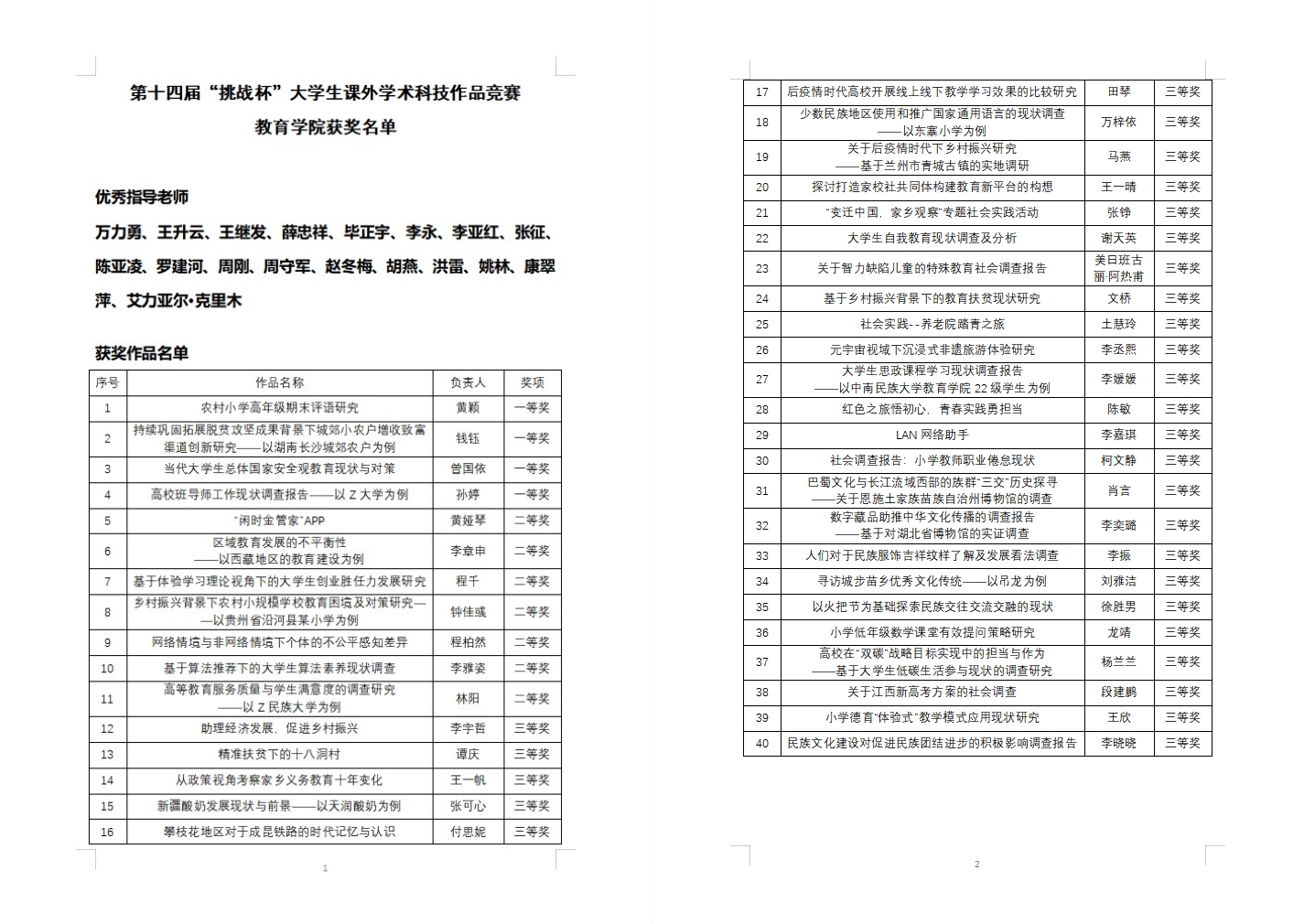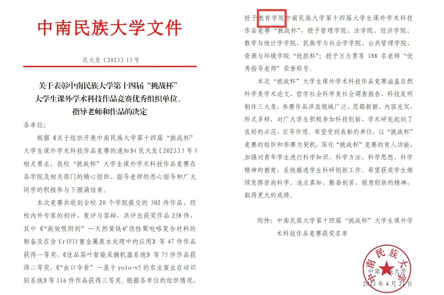 “挑战杯”赛事举办二十余年来,在青年学生中推动形成了激发创新精神、促进创业实践的良好氛围,培育了一批批勇于创新、敢于创业的有志人才。在2023年学校第十四届“挑战杯”大学生课外学术科技作品竞赛中,教育学院以实际行动贯彻落实党的二十大精神,引导和激励学生积极参与,荣获“挑战杯”单位。全校238件获奖作品中,教院获奖作品40件,其中一等奖4件、二等奖7件、三等奖29件,提交作品和获奖作品的数量、质量都达到新高。