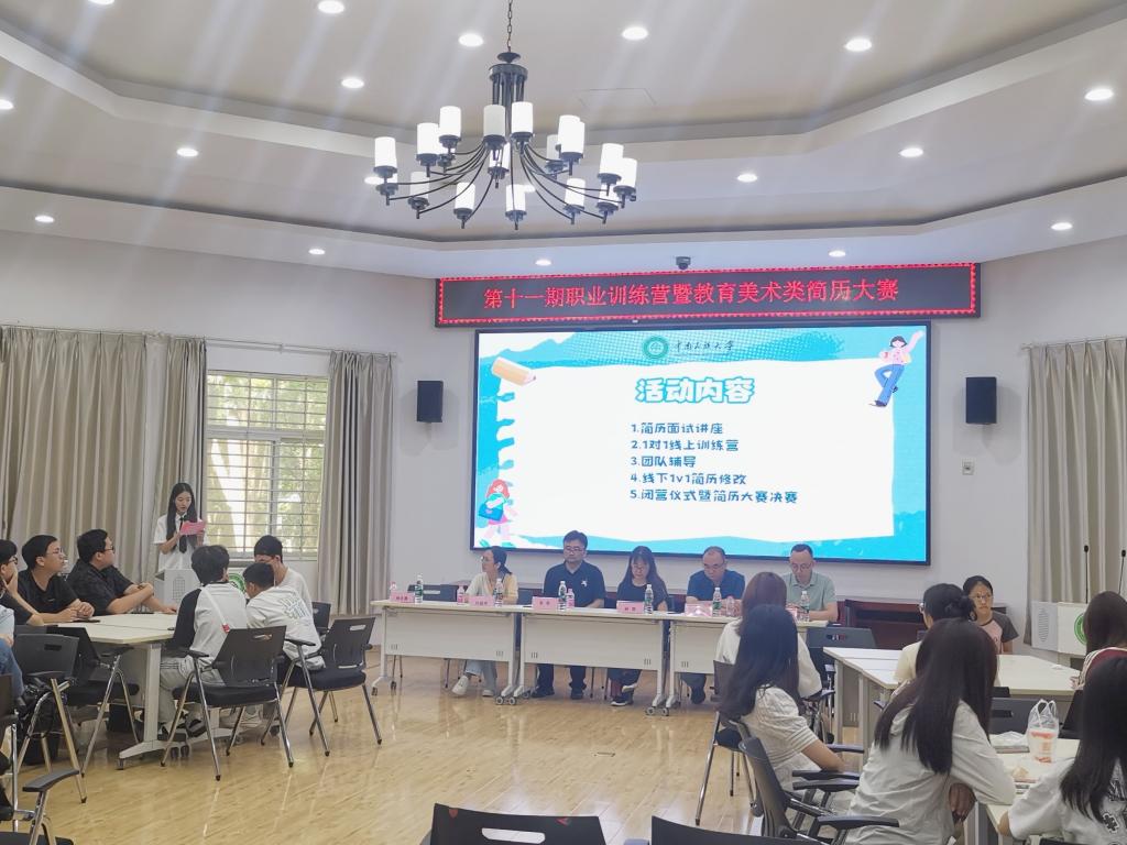 为帮助学生提升职业规划和简历撰写能力,提升就业竞争力。近期,学校举办第十一期职业训练营暨教育美术类简历大赛,本次活动由招生就业工作处主办,教育学院和美术学院承办。5月25日上午在4号楼多功能厅举办开营仪式,学生工作部、招生就业工作处、创新创业学院、教育学院、美术学院学生工作负责人,来自各学院50名学生代表参加了开营活动。