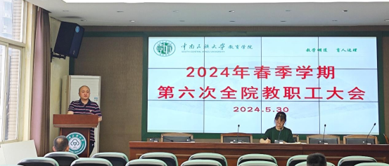 2024年5月30日中午,教育学院于15号教学楼741会议室组织召开了2024年春季学期第六次全院教职工大会暨本科教育教学审核评估工作推进会。学院领导及全体教职工参与会议。会议由学院党委书记林晋主持。
