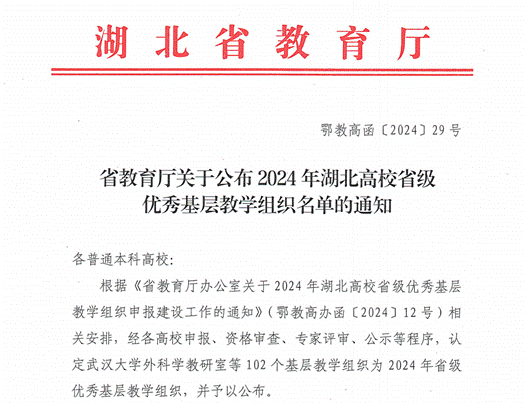 近日,湖北省教育厅发布了《省教育厅关于公布2024年湖北高校省级优秀基层教学组织名单的通知》,我院教育学教研室被评为2024年湖北高校省级优秀基层教学组织。