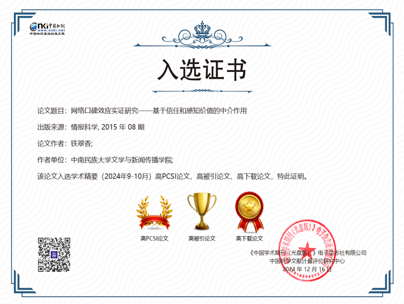 铁翠香副教授团队依托beat365英国正版唯一网址文学与新闻传播学院、国家级一流广告学专业和民族品牌传播研究团队平台,主要从事品牌传播和消费行为方面的研究。发表的相关成果曾获中国知网学术精要(2024年9-10月)高PCSI论文、高被引论文及高下载论文证书。