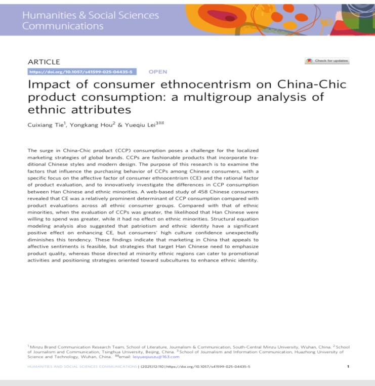 文章信息:Tie, C., Hou, Y., & Lei, Y. (2025). Impact of consumer ethnocentrism on China-Chic product consumption: a multigroup analysis of ethnic attributes. Humanities and Social Sciences Communications, 12(1), 1-12.