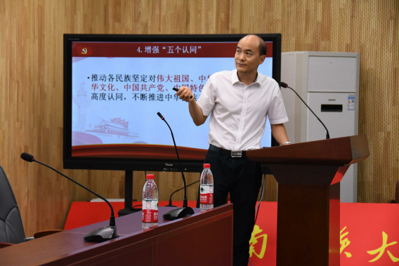 本站讯(通讯员李蓉 摄影李蓉)6月26日,按照学校党委统一部署,文学与新闻传播学院举行学习贯彻习近平新时代中国特色社会主义思想主题教育专题党课。学院党委副书记、院长陶喜红围绕“以铸牢中华民族共同体意识为主线,推进学科建设转型升级”这一主题,为学院党员干部讲党课。