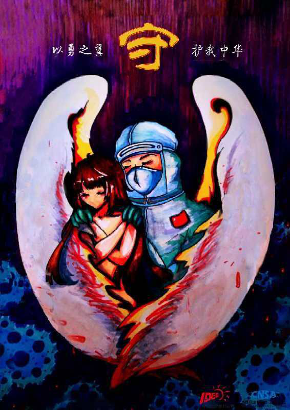 申雨心和易江南同学创作的《守》是想体现医者的“守护”。这一想法源自易江南同学的生活经历:“我叔叔是医生,他在我们城市的医院工作,春节不能回家。想到武汉肯定有很多这样奋战在一线的医护人员,我们的平安是有他们在守护,所以就画了这样一幅画。” 守是会意字,宀表示房屋,寸在古代又是“手”的意思,结合自己的专业知识,易江南把医生的“守护”更加具象化,化“宀”为医护人员的翅膀,“寸”即是医护人员的手,也代表着坚持。而作品中的少女不仅是患者的具象,也代表了美好,象征着希望,易江南认为医者要守护的不仅仅是病患,还有人们的希望。同时黄色的“守”字也象征着光源,“背景是暗的,但我们还有光,医护人员的守护就是光,也是希望”。