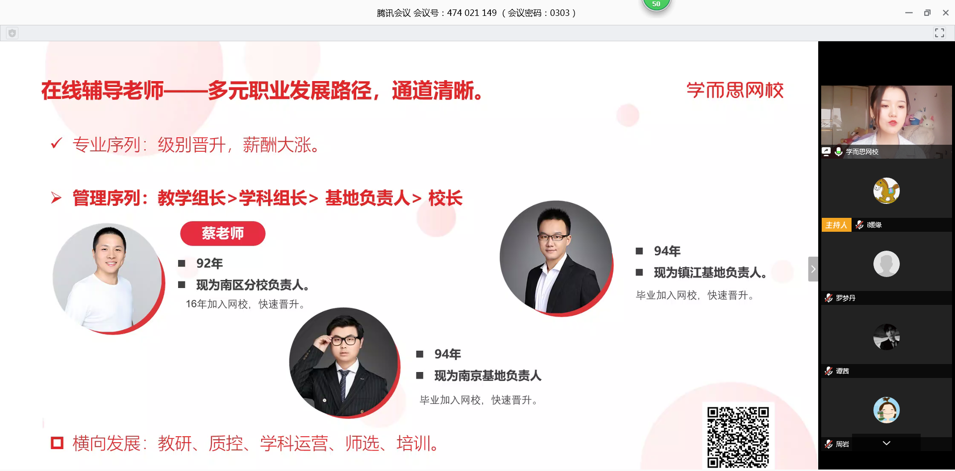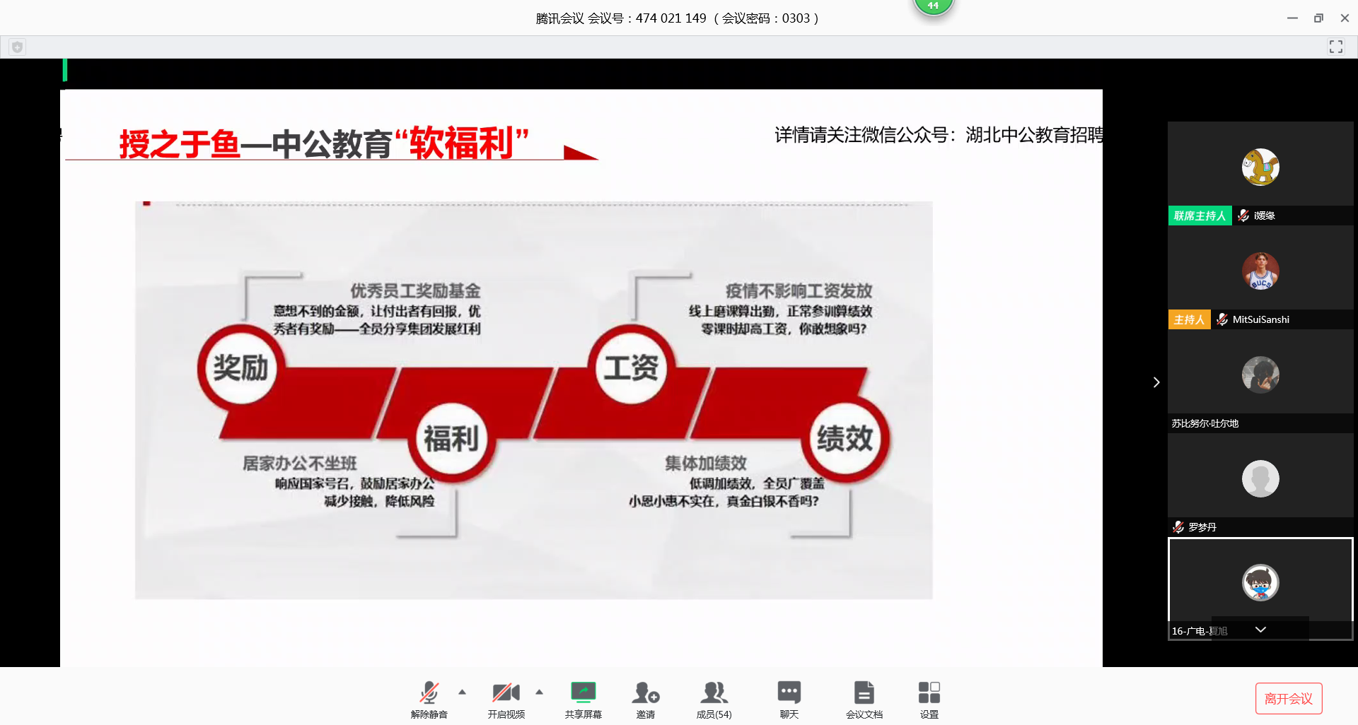 2016级辅导员卡迪尔旦老师介绍了2020届本科毕业生的基本情况,随后郭旋老师主持开展招聘活动。各家企业负责人在线宣讲,从公司发展历史、岗位需求、发展前景等方面进行介绍,共提供教育、管理、培训、市场等各类岗位200余个。随后,各家企业分别开展线上招聘和答疑。