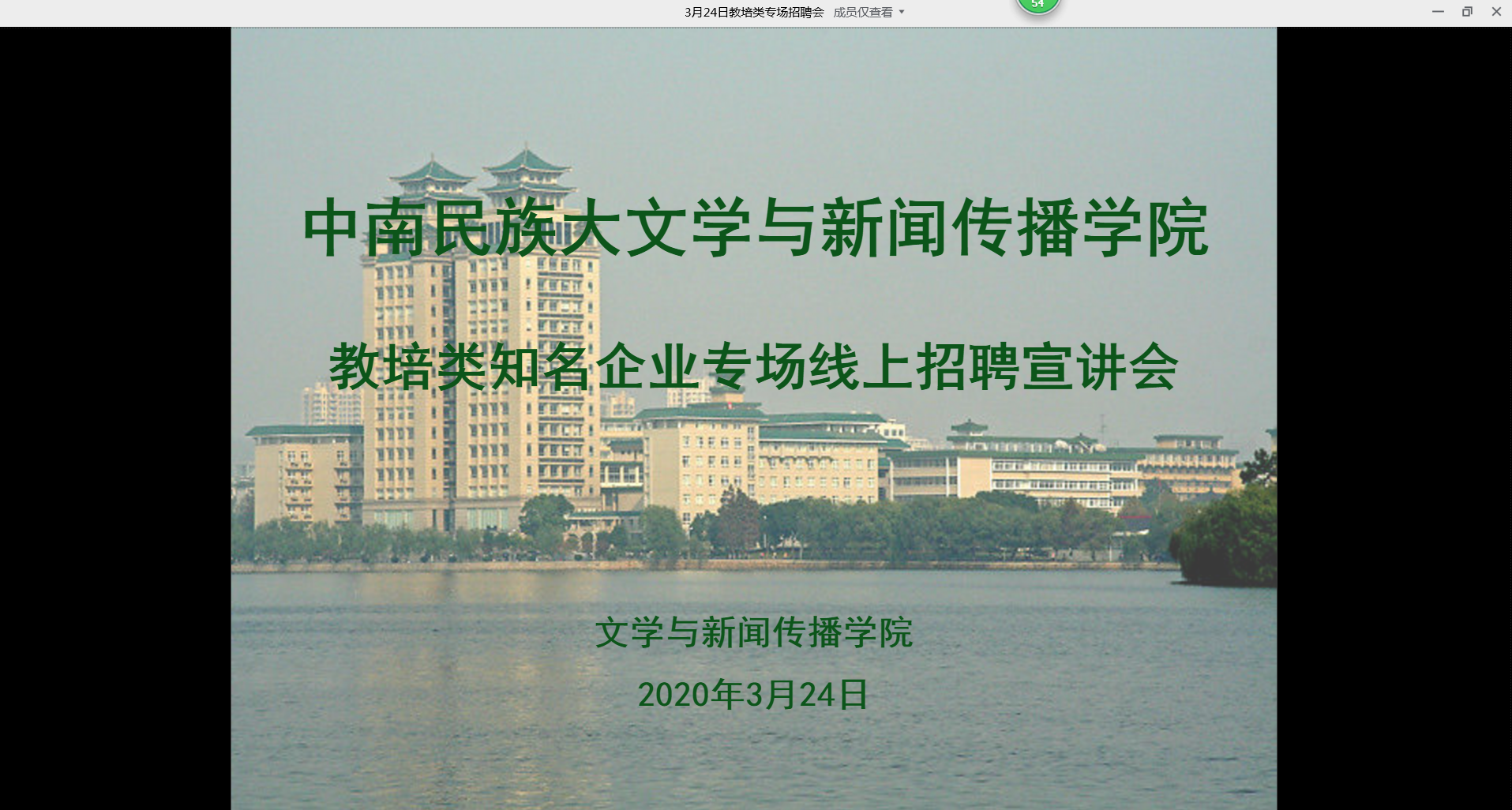 3月24日上午,文学与新闻传播学院通过“腾讯会议”平台组织举行2020届本科毕业生教育培训类专题线上招聘会,新东方集团、中公教育、学而思网校、猿辅导等四家企业相关负责人及招聘经理、院党委副书记张文军、2016级辅导员郭旋、卡迪尔旦老师及应届毕业生200余人参加此次招聘会,本次招聘会由郭旋老师主持。