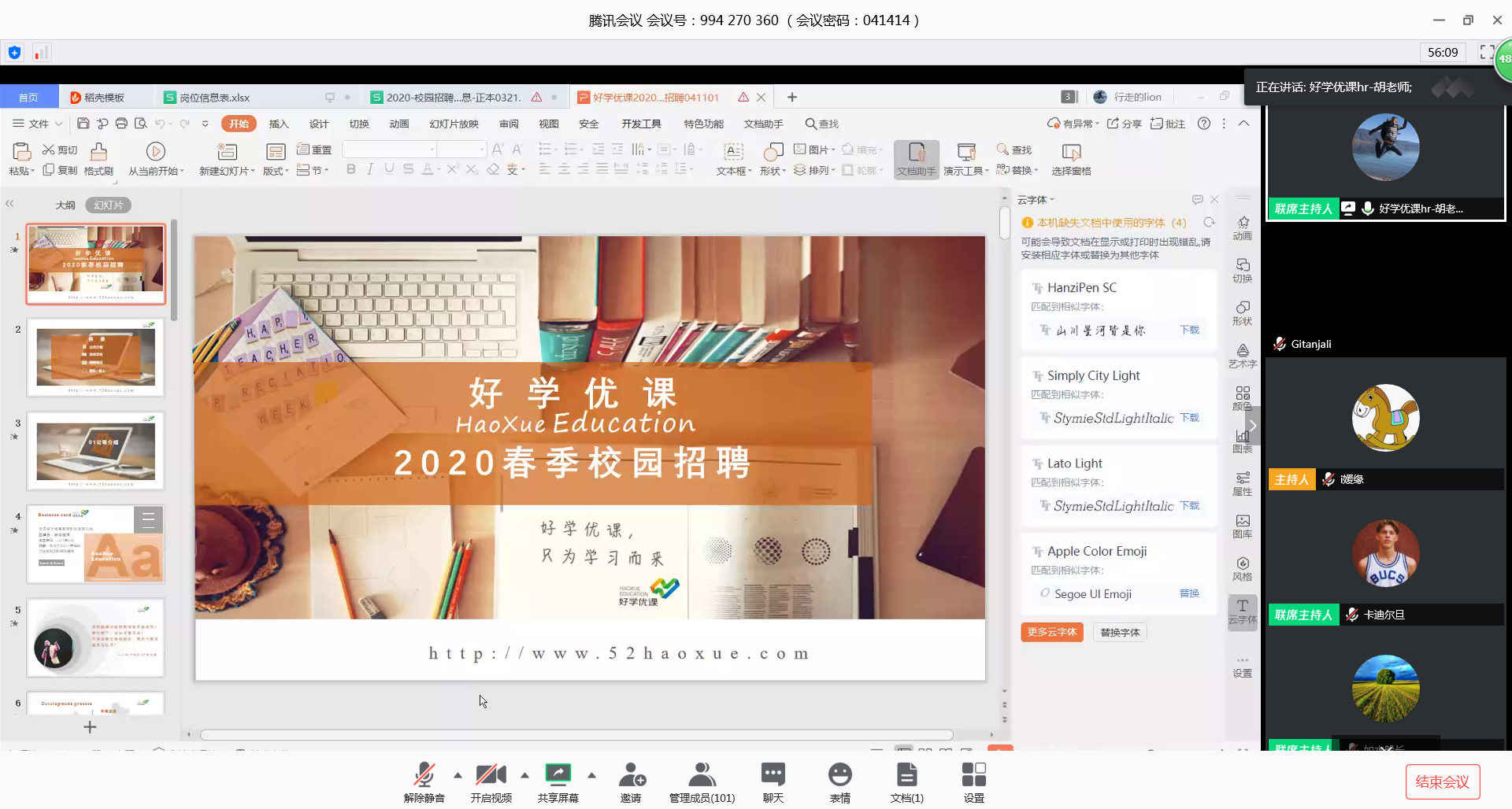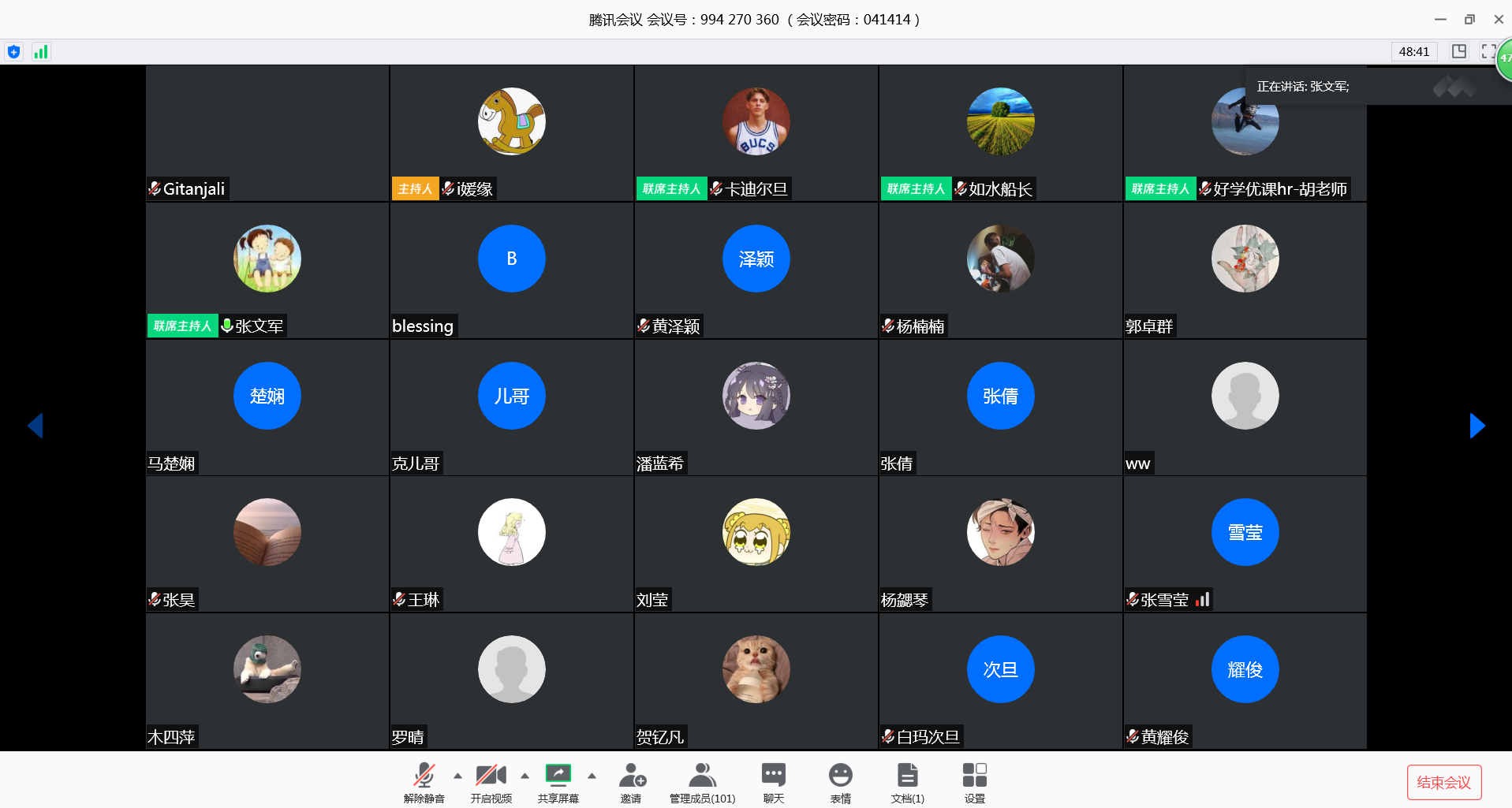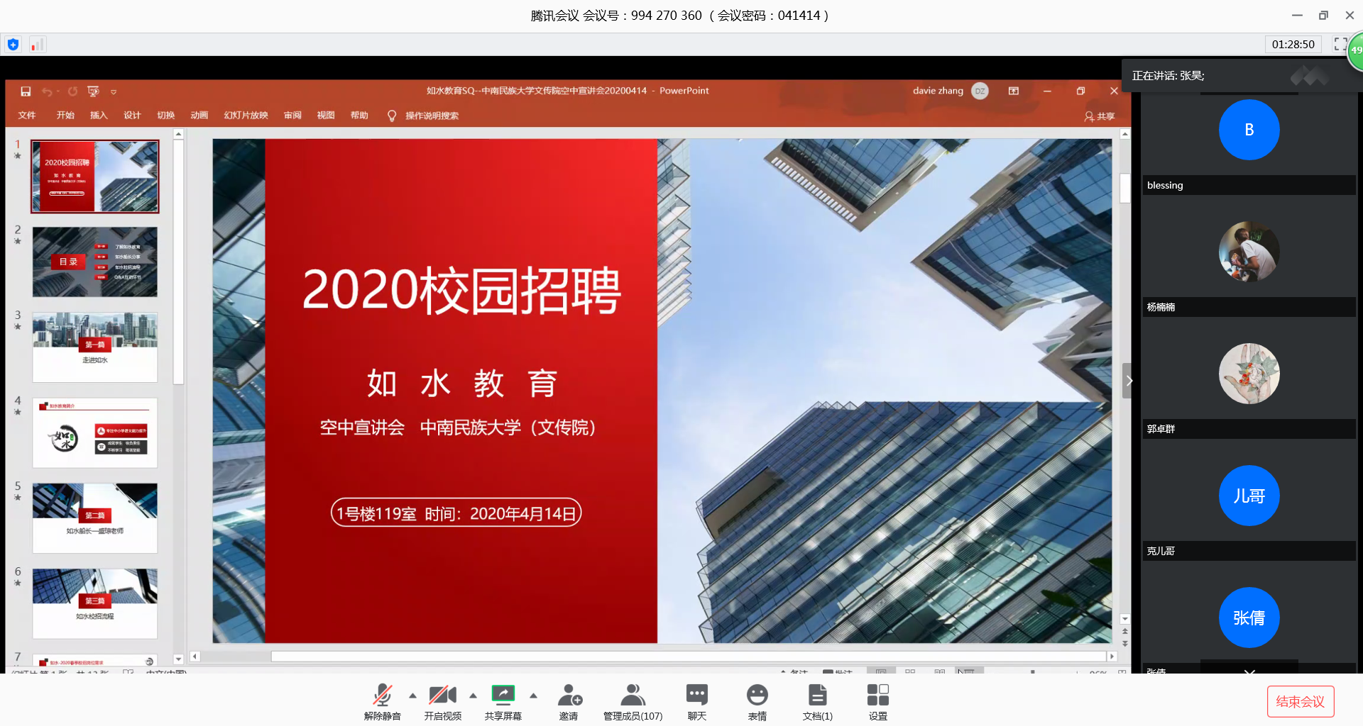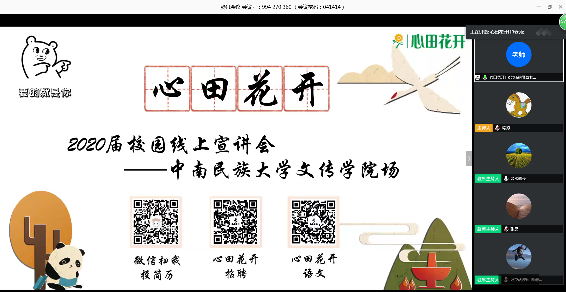 4月14日上午,文学与新闻传播学院通过腾讯会议平台组织了2020届毕业生第三场线上专场招聘会,邀请了武汉好学铭智教育科技有限公司、武汉市硚口区如水培训学校有限公司、成都心田花开科技有限公司等三家教培类知名企业进行宣讲;文传学院党委副书记张文军、2016级辅导员郭旋、卡迪尔旦以及110余名毕业生参加此次宣讲会,本次宣讲由郭旋主持。