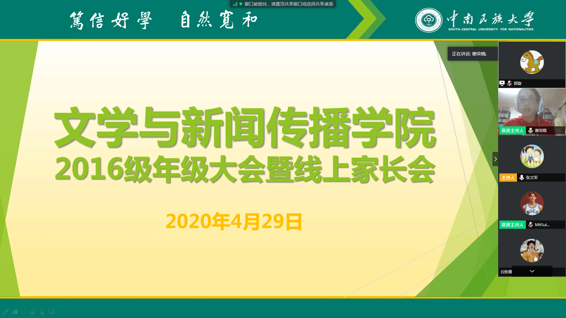 新冠疫情对毕业生毕业就业工作产生不利的影响,为推动毕业生毕业就业工作的顺利开展,我院于4月29日、30日分别召开中国语言文学类和新闻传播类2020届毕业生年级大会暨线上家长会,此次会议运用腾讯会议软件在线进行。院党委书记韩昕、院长刘为钦、副书记张文军、副院长陶喜红、副院长谢荣娥、2016级辅导员郭旋、辅导员卡迪尔旦、500余名毕业生及家长参加此次会议,会议由张文军主持。