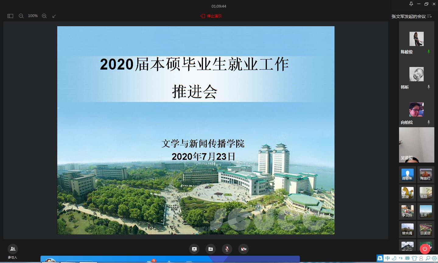 7月23日,我院在企业微信线上召开2020届本硕毕业生就业工作推进会。会议由院党委书记韩昕主持,学院领导班子、二级学科负责人、本科专业负责人、教研室主任、毕业班班主任、辅导员参加会议。