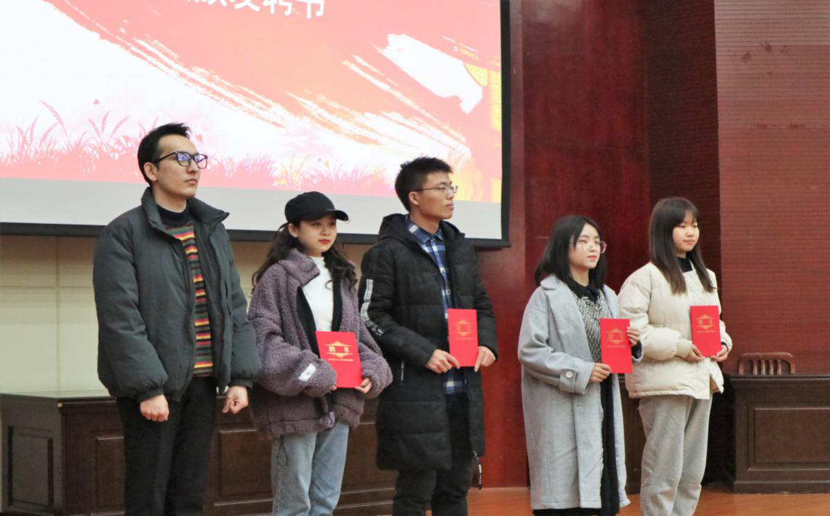 大会对优秀团员、优秀班级和最佳组织奖班级进行了表彰,并宣读了第七届基层团校对谢浩、魏祎、兰孜、李懿婧四位带班人的聘任文件。张书记和阿达来提老师进行颁奖,卡迪尔旦老师为四位带班人颁发聘书。阿丽米热·牙克木江代表优秀团员发言,总结了她的学习经验和学习心得。李懿婧同学代表四位带班人进行发言,她表示希望同学们不忘初心,脚踏实地投身实践,砥砺前行。