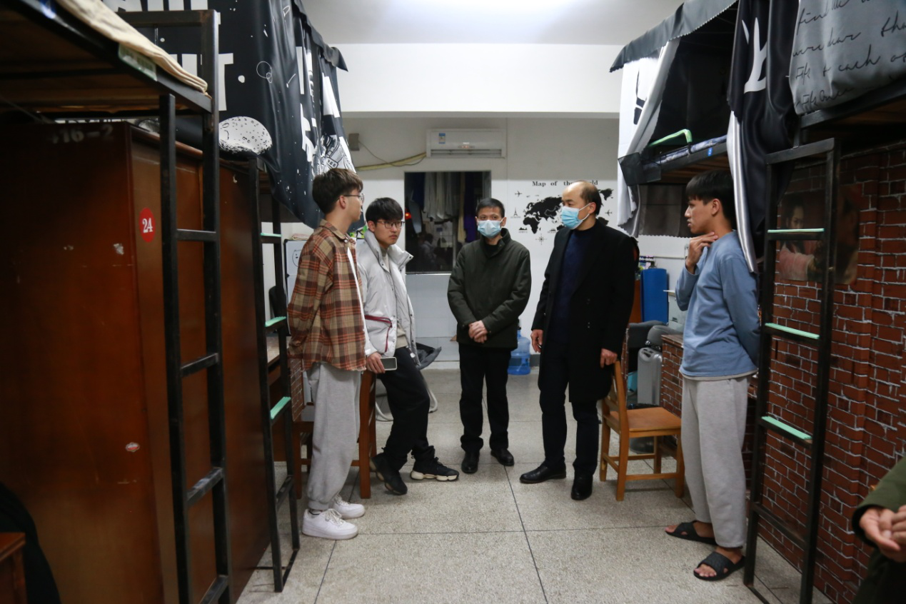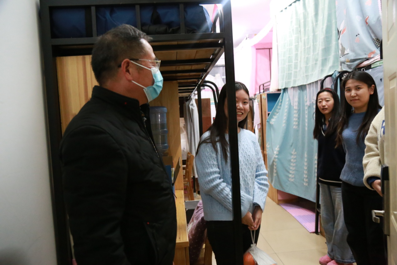 “是找工作还是考研呀?找工作的话简历写好了吗,考研的话是考哪个学校的研?”、“学分够不够?”、“毕业论文、简历写好了吗?”……细致入微的问题,传达着领导老师们对毕业生的深切关心。注意到穿得单薄的同学,还贴心地提醒大家要注意保暖,时刻保持良好的身体状态。领导老师们与学生亲切融洽地交谈,整个寝室充满了欢声笑语。