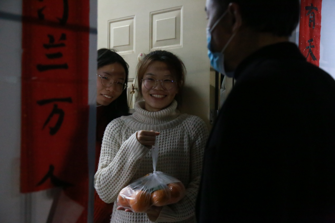 这次慰问,让17级的毕业生们感受到了来自领导老师和学院的关爱。当接到蕴含满满心意的橙子时,同学们个个喜笑颜开。我院领导老师们润物无声的关怀,如潺潺暖流汇入毕业生们的心田。在这个寒冷的冬天,应届毕业生们将带着这份关怀,心存感激、砥砺前行。