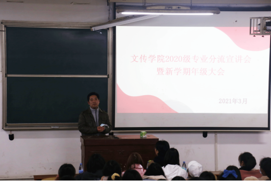 本站讯(通讯员努尔比叶  摄影秦欣然)我院2020级中国语言文学类专业分流宣讲答疑会暨新学期年级大会于3月19日下午17时30分在文一楼201教室召开。我院副院长陈啸、国际汉语教育专业教授夏耕、中文专业副教授杨秀芝、2020级辅导员卡迪尔旦出席此次会议,全体2020级中国语言文学类专业学生参加此次大会,大会由卡迪尔旦老师主持。