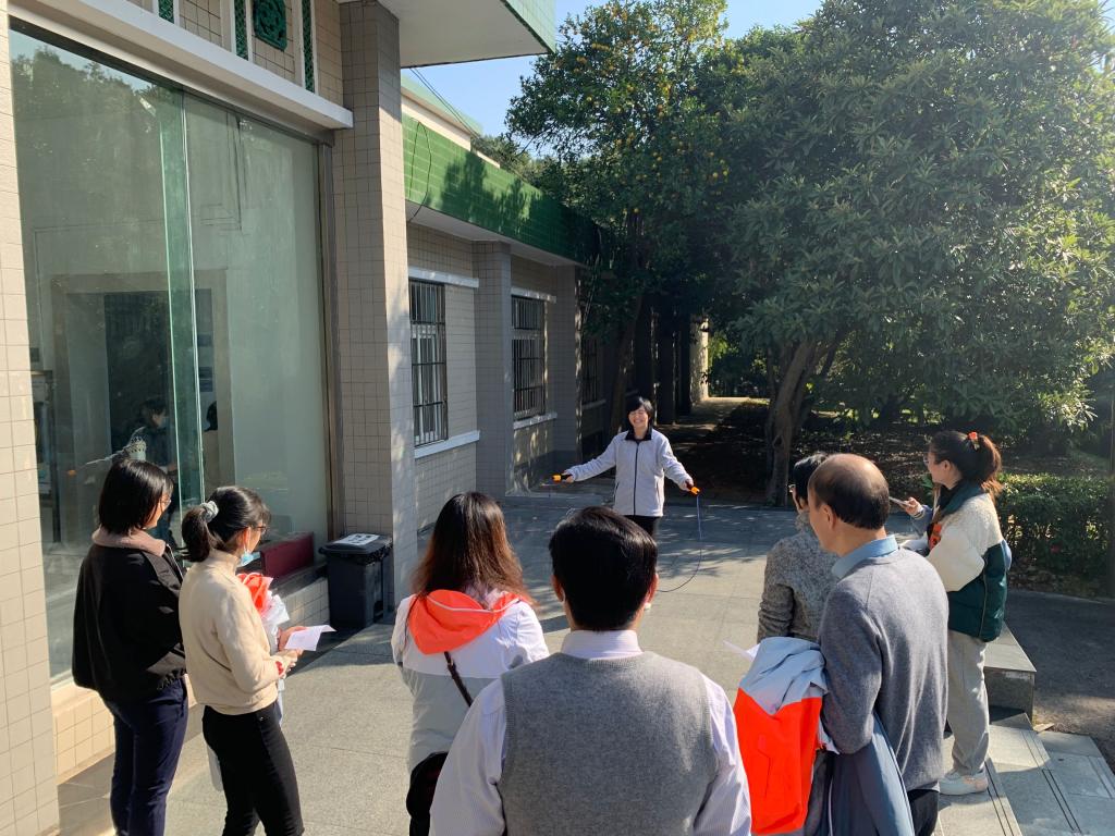 大厅外是跳绳项目,沐浴着阳光,教师们跳动起来。也有不少围观老师发出感叹:“身体素质不如以前了,还是要多加强锻炼才行。”