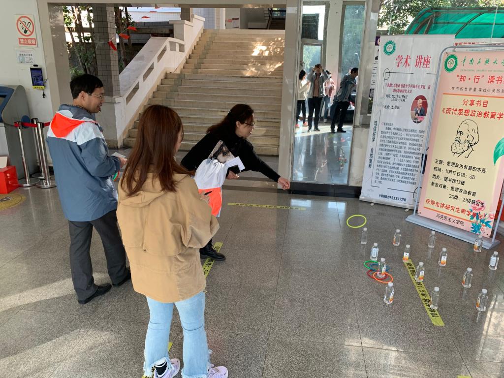 下一项是套圈项目,这是一项锻炼手力、视力与毅力的智趣游戏,许多教师在第一次尝试过程中都没有达到完成要求,但是他们不言气馁,多次挑战,最终通过了套圈项目。