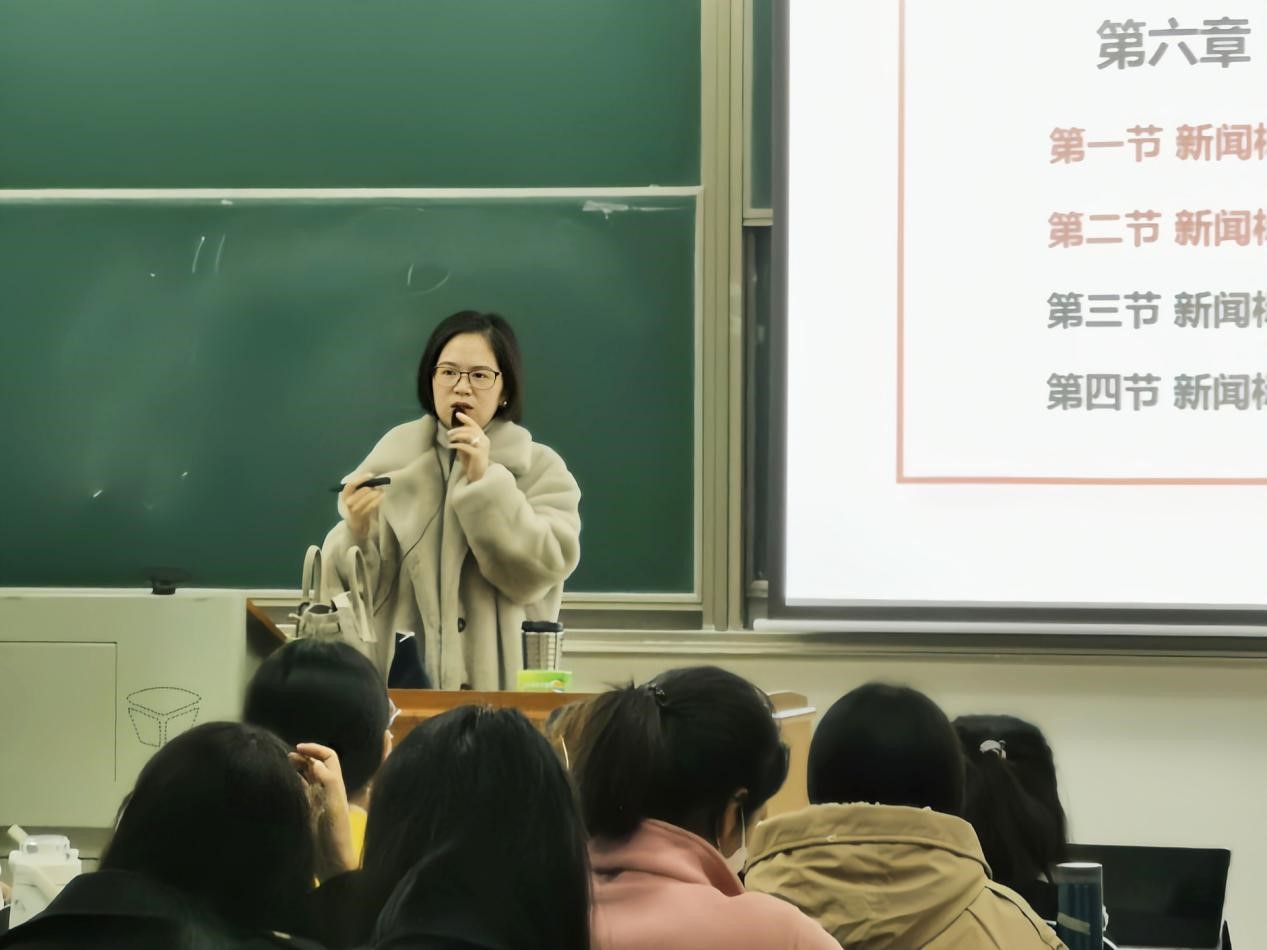 在课堂中,田园子老师十分注重将思政教学元素融入专业课程之中,寓价值观引导于知识传授之中,积极引导同学们形成正确的新闻理念。“新闻编辑无小事,一个标点的失误就可能造成截然不同的解读从而引起严重的后果。”她向同学们强调了新闻的专业性,指出一名合格的新闻编辑必须坚持党性原则、真实性原则,对于报道性新闻不仅要告诉受众发生什么,还要告诉受众如何正确看待,在撰写报道时褒贬适度、分寸得当。课后,新闻支部的几位老师与田园子老师交流课程思政的目标与做法。