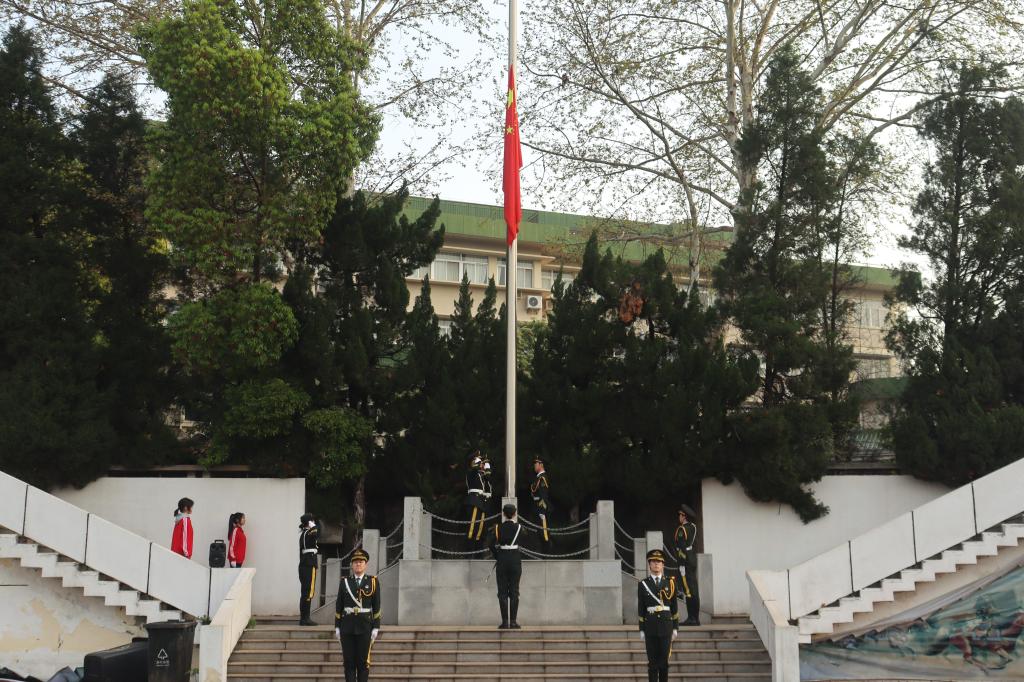 迎着初春的朝阳,国旗护卫队着装整齐,迈着坚定的步伐护送五星红旗入场。伴着《义勇军进行曲》,全体师生奏唱国歌,庄严肃穆。五星红旗在师生的注目下冉冉升起,飘扬在南湖畔。