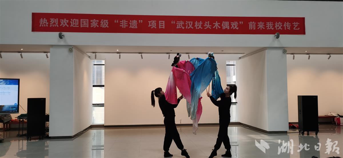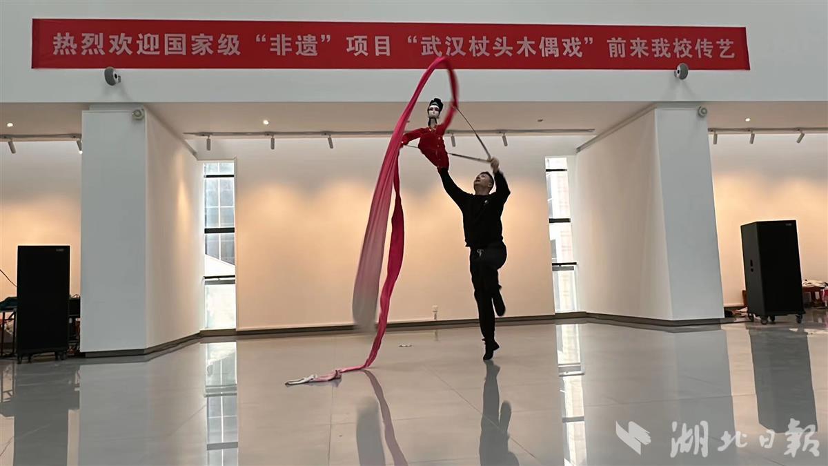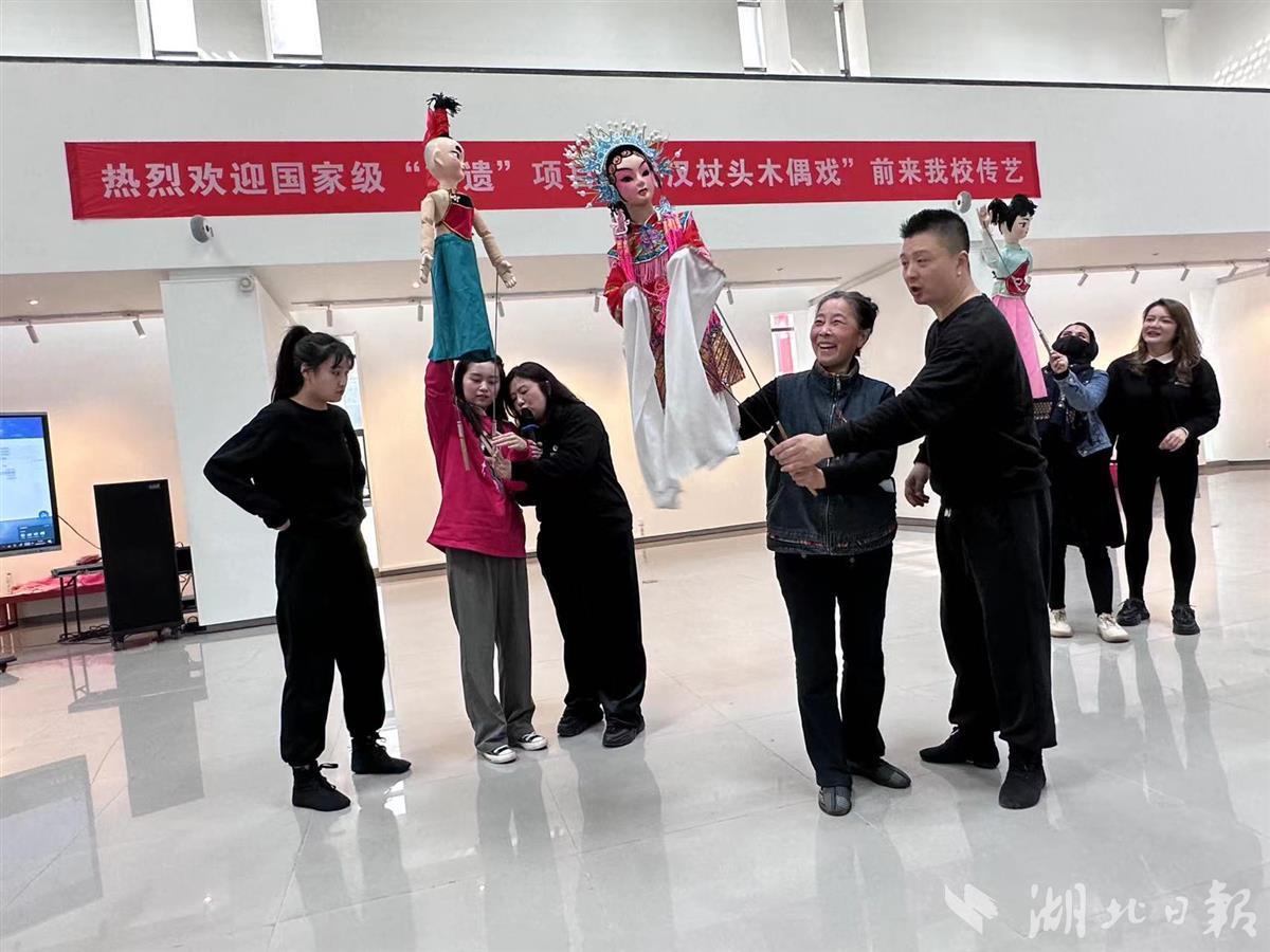 为弘扬中华优秀传统文化,积极推动非遗进校园,我院联合美术学院、国际教育学院,邀请武汉杖头木偶戏传承人来校,参与《中华才艺》开放课堂活动。