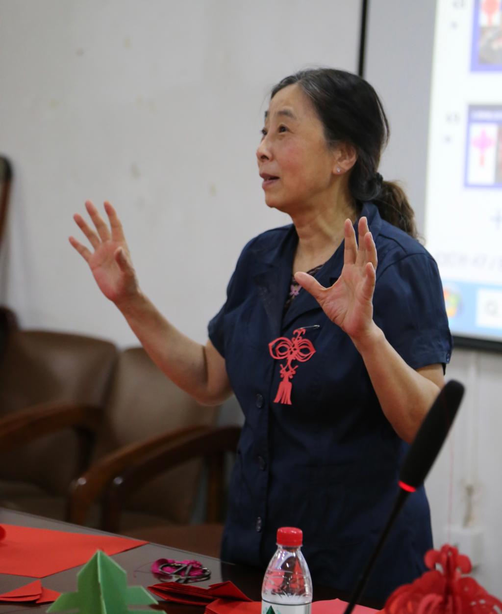 何老师说:“中国结首尾相连,从任何一个起点出发都可以回到原点,它的俗称为:路路通,事事顺,也被称为盘长”。紧接着,她谈到,中国结的剪法是先将一张正方形纸张对折三次,在第四次对折时,不要对齐,留出一寸,翻过来,在下边剪掉一个等腰直角三角形,打开三次后,剪掉一边的“脚”,另一边的“腰”,打开来就是一个完整的“中国结”纹样。“这个角需要修得圆润一点”“这个边不均称”,何老师说。大家按照刚刚的方法又成功剪出了小型中国结,当各位辅导员展开中国结,互相切磋、互相交流时,会议室里笑声不断。有一句话说得好,“一棵树摇动另一棵树、一片云推动另一片云”,中国剪纸的传承也需要年轻老师的加入和推动。