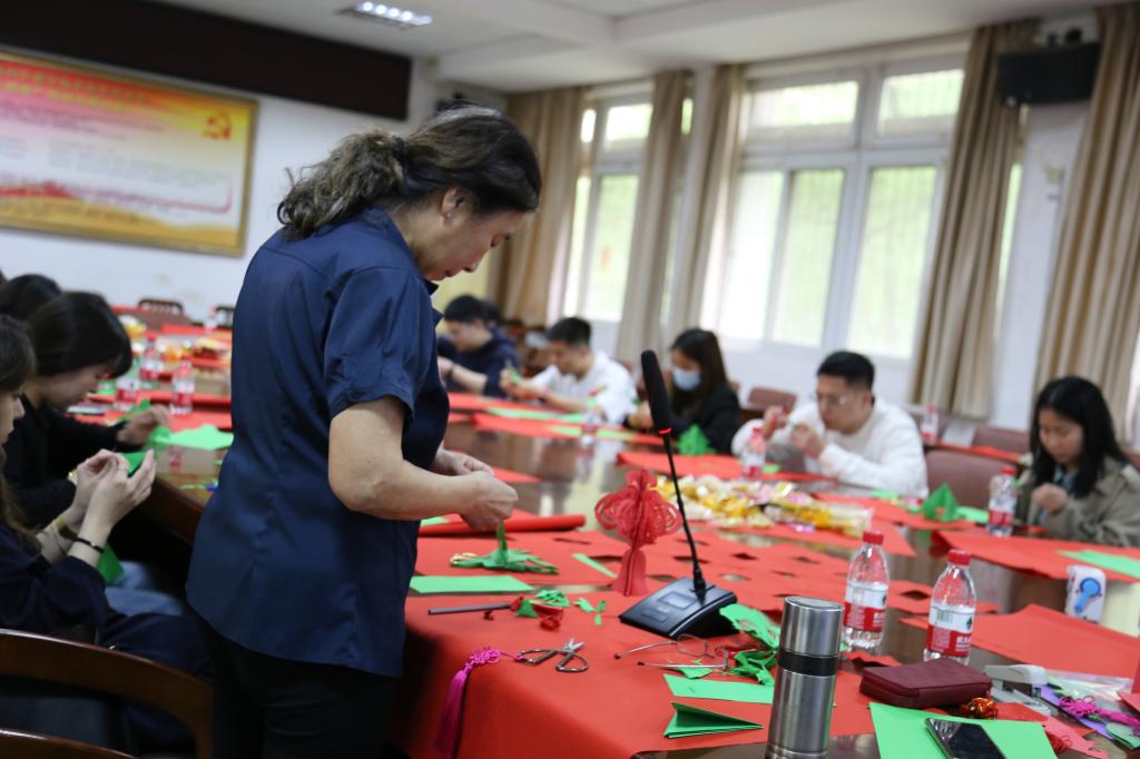 一张纸片,一把剪刀,就可以从事剪纸创作。在现场实操环节,何老师先向大家示范立体“春”字和中国结的剪法,然后让大家在体验中感受中国剪纸的艺术美。她谈到,要剪好立体“春”字要先学会折纸。先将一张正方形的纸折成一个双三角,然后再对折一次,在上面剪出“春”字的一半,打开即为一个立体的“春”字了。折剪,充分体现了“事半功倍”的道理。各位辅导员跃跃欲试,纷纷拿起剪刀剪了起来。“你运剪的方向错了”“宽度要适宜,整体要协调”何老师边指着“春”字边说。不一会儿,辅导员们纷纷展示成果,用绿色卡纸剪出来的“春”字显得格外有春意,何老师还向大家展示了自己所剪的迷你“春”和巨型“春”,彰显了剪纸的适应力和张力。