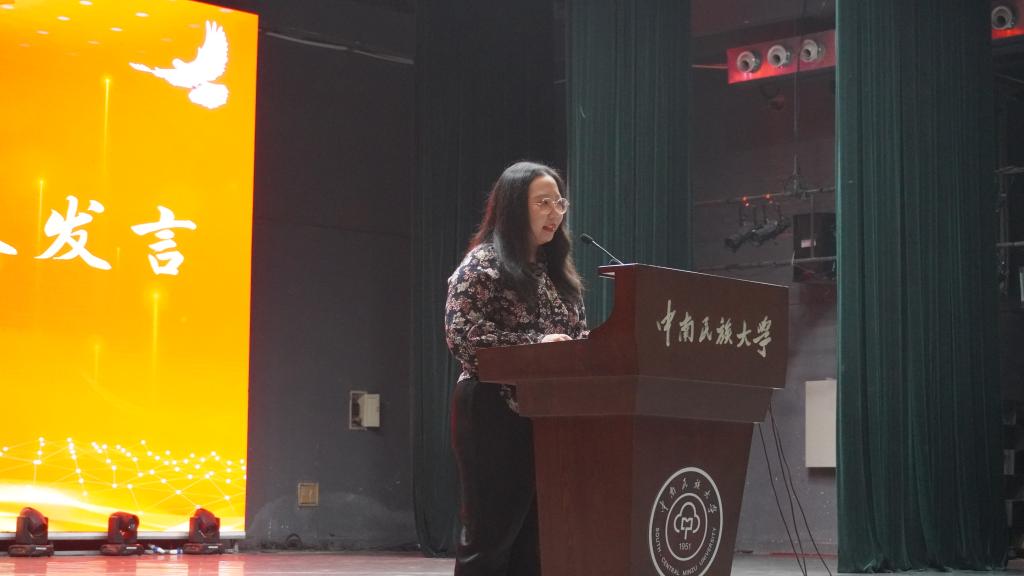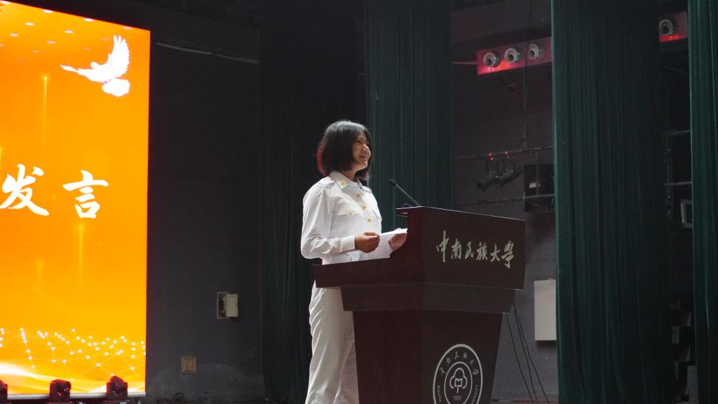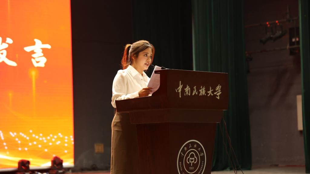 老生代表2021级本科生朱璇向全体新生分享成长感悟:在学习上同学们需探索适合自身的学习方式,并在实践中将所学理论外化于行,提升专业素养;2023级本科生代表李啟蓉在今年告别军营生活,重返民大校园。在发言中她表达对重返校园生活的喜悦与未来生活的憧憬;2023级研究生代表魏雨洁对自己七年的民大求学经历进行总结,号召全体新生以社会价值为实现自我价值的基础,将个人发展与时代进步相结合。
